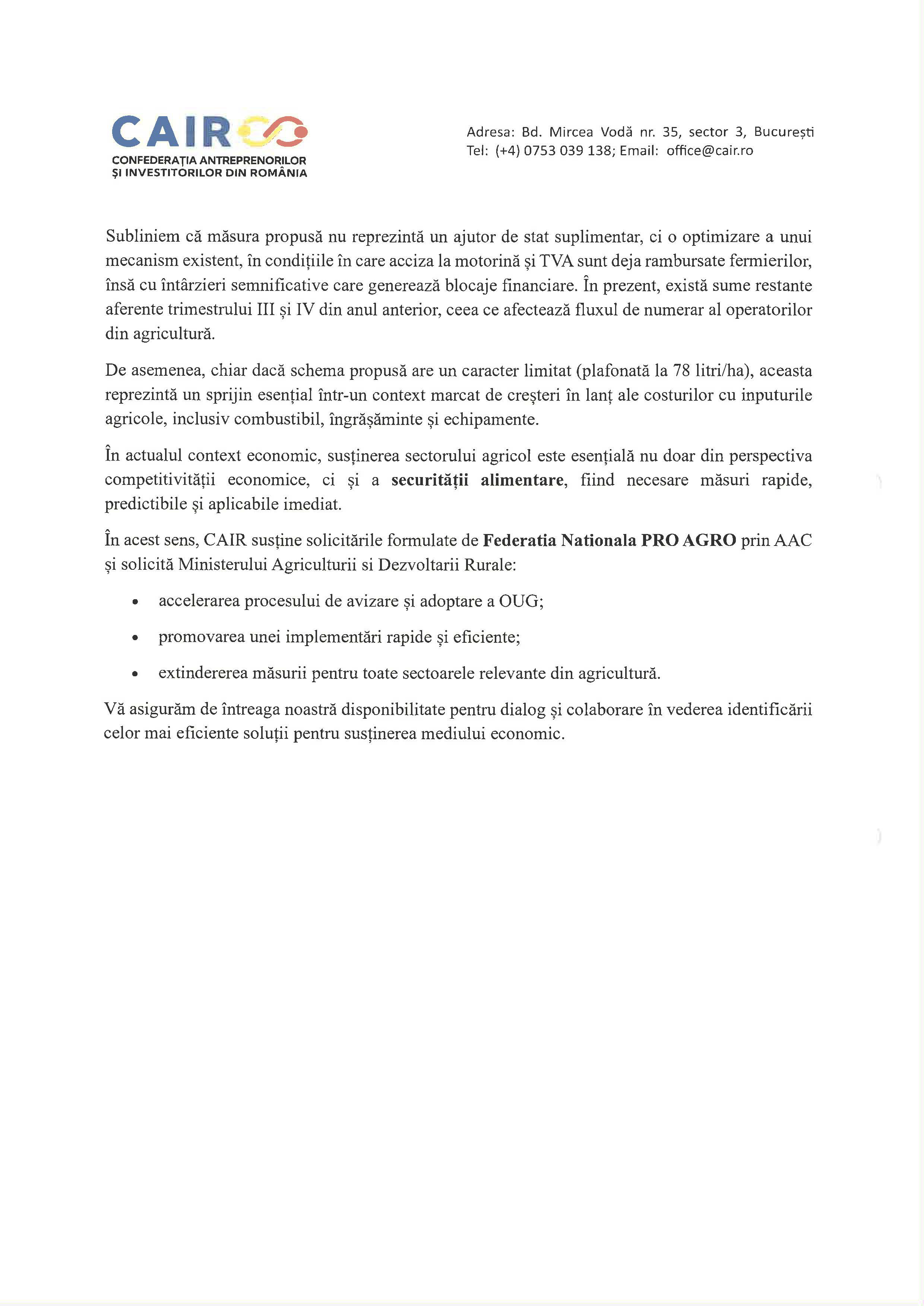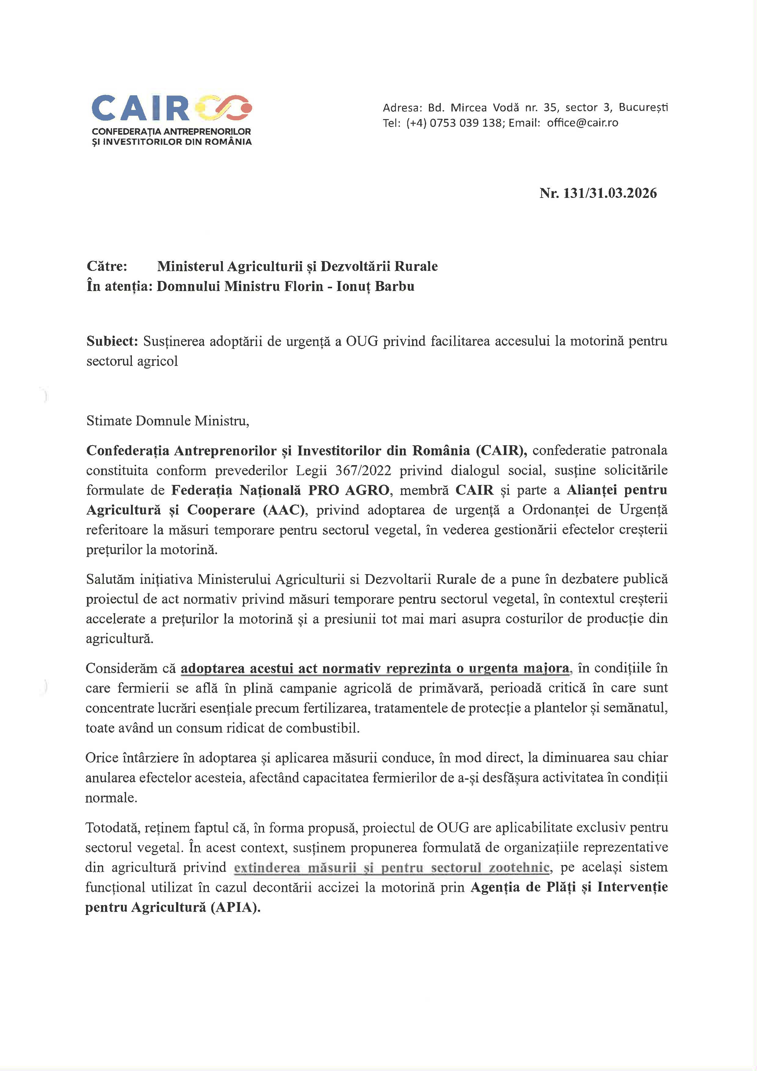 Adresă CAIR 131/31.03.2026 catre Ministerul Agriculturii și Dezvoltării Rurale privind Susținerea adoptării de urgență a OUG privind facilitarea accesului la motorină pentru sectorul agricol