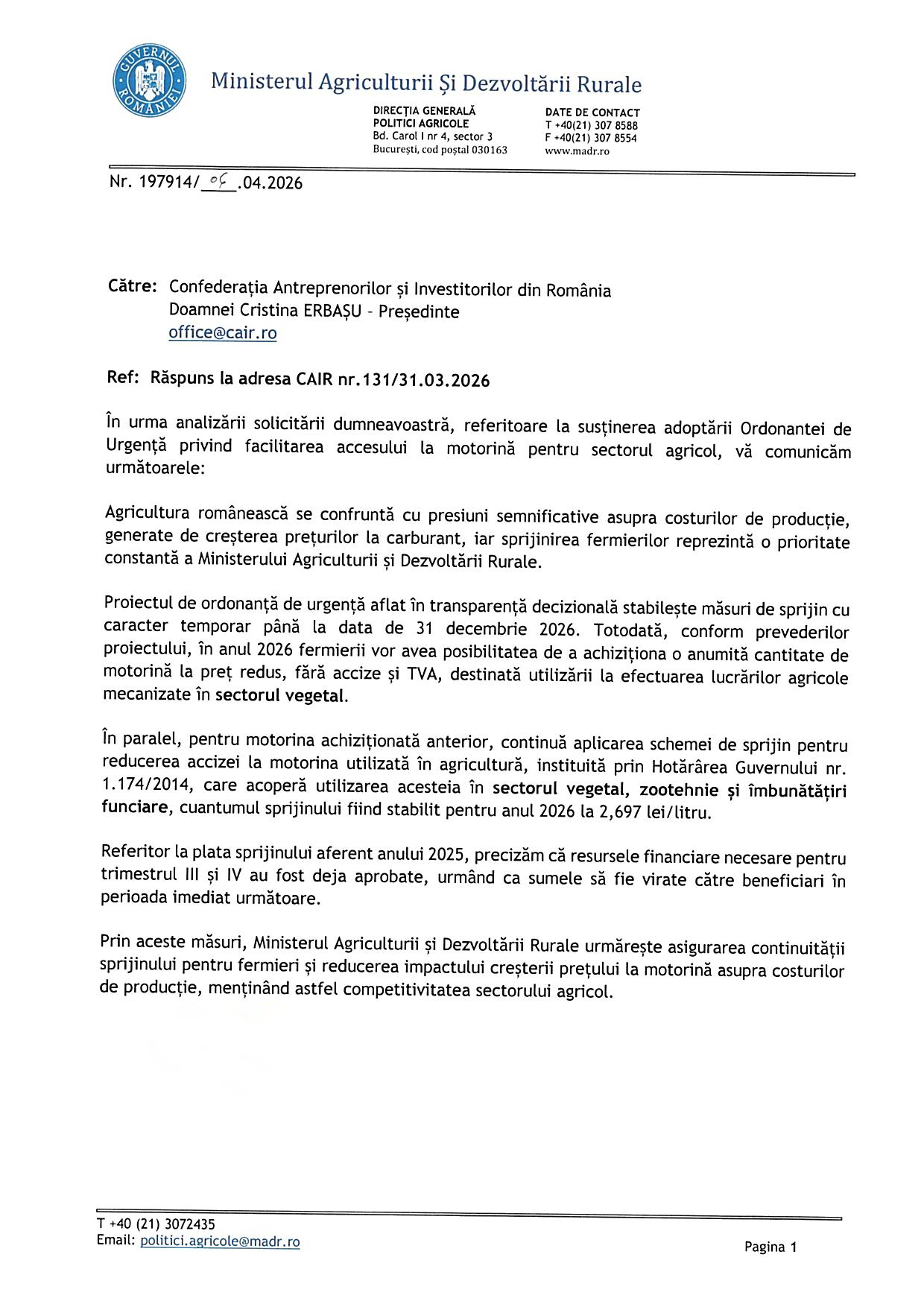 Răspuns Ministerul Agriculturii și Dezvoltării Rurale la adresa CAIR 131/31.03.2026 privind Susținerea adoptării de urgență a OUG privind facilitarea accesului la motorină pentru sectorul agricol